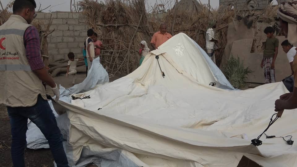 بدعم اماراتي هيئة الهلال تقدم الايواء الطارئ للاسر النازحة والمتضررة بالساحل الغربي.