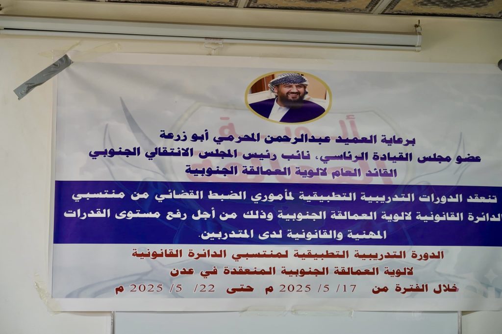 وشارك في الدورة 25 متدربًا من مأموري الضبط القضائي، التابعين لدائرة شؤون قانونية قيادة ووحدات قوات العمالقة الجنوبية، الذين تلقوا التدريبات في الدورة على يد دكاترة متخصصين في قانون ومهارات الضبط القضائي.